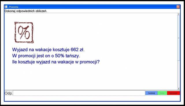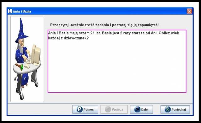 Rozwiązywanie tego typu zadań jest realizowane z użyciem specjalnie zaprojektowanego kreatora. Uczeń czyta i analizuje treść zadania. Na kolejnych planszach, uczeń musi wskazać: dane zadania, szukane, wartości danych i wreszcie wprowadza wyniki. Przejście do kolejnego etapu rozwiązywania zadania możliwe jest po prawidłowym wykonaniu danego etapu.