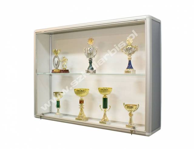 Gablota ekspozycyjna na puchary wykonana w całości z profili aluminiowych anodowanych. Narożniki gabloty plastikowe. Drzwi szkło akrylowe w ramie aluminiowej unoszone do góry, zamykane na dwa zamki. W zestawie półka z grubego szkła szlifowanego w trzech płaszczyznach z możliwością regulacji wysokości.