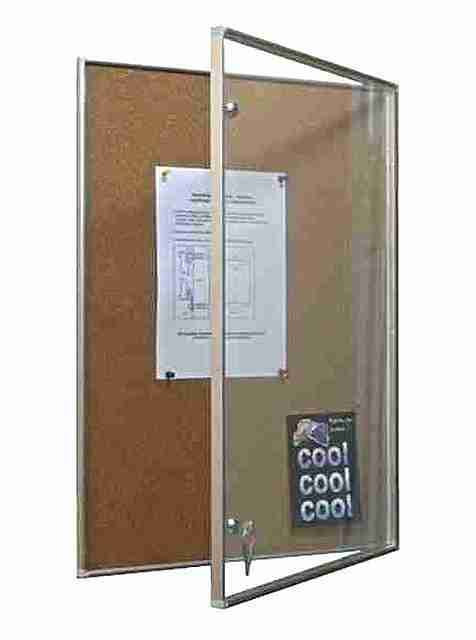Gabloty ogłoszeniowe. Gablota ogłoszeniowa GMR wykonana z bezpiecznego szkła akrylowego. Rama gabloty aluminiowa anodowana w kolorze srebrnym, narożniki plastikowe. Drzwi uchylne zamykane na dwa zamki.