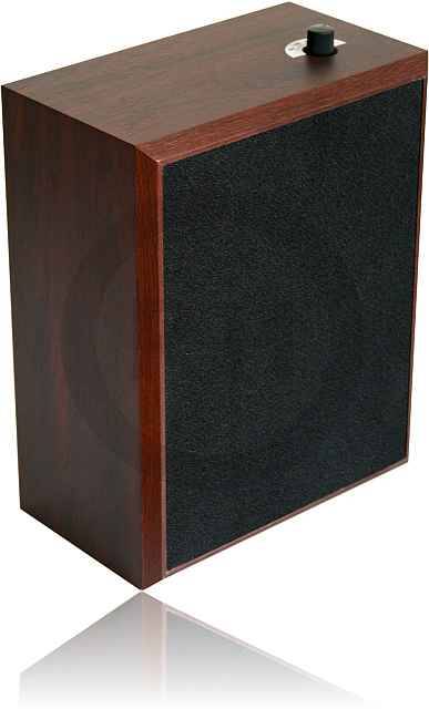 Obudowa wykonana z drewna z frontem wykonanym z czarnego materiału.