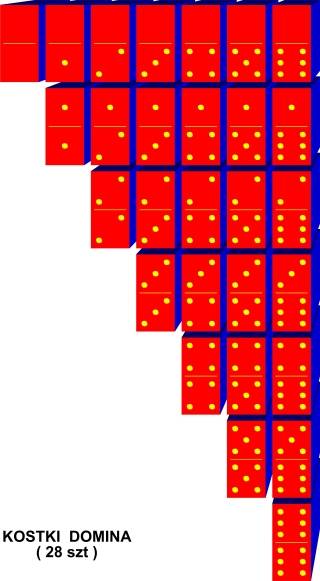 Komplet to 28 kolorowych kostek zawierających odpowiednią ilość kropek do gry w Domino.