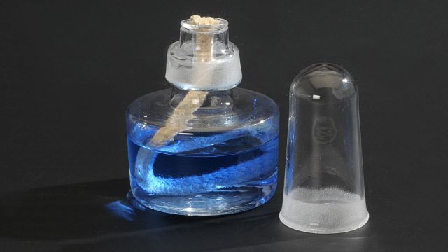 Opis produktu: Szklany palnik spirytusowy z trójnogiem i płytką metalową