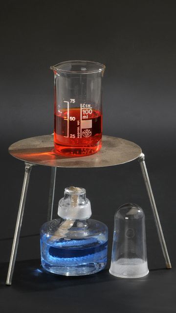 Szklany palnik spirytusowy z trójnogiem i płytką metalową