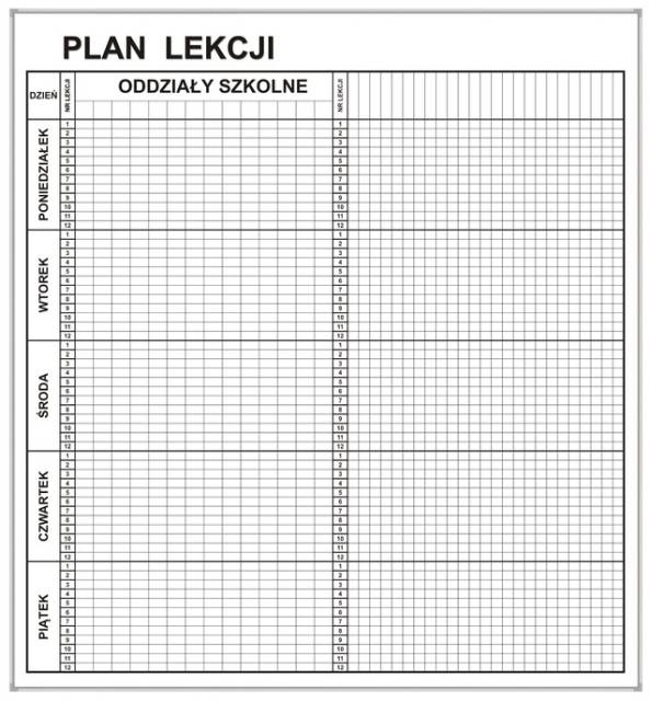 Tablica do układania planu lekcji z możliwością pisania markerami suchościeralnymi. Nadruk wykonany w technologii uniemożliwiające jego usunięcie. Oprawiony w ramę aluminiową anodowaną. Do układaniu planu lekcji służą kolorowe znaczniki magnetyczne. W komplecie po 30 znaczników dla każdego nauczyciela oraz zestaw montażowy wraz z instrukcją. Tablica zapakowana w karton.