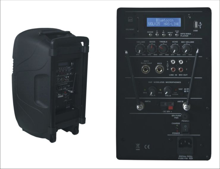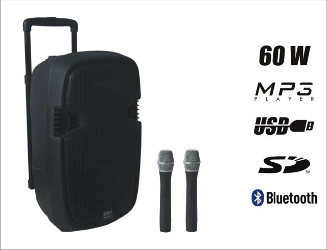 Aktywny dwudrożny, przenośny system nagłośnieniowy PA z wbudowanym akumulatorem oraz podwójnym mikrofonem bezprzewodowym. Wbudowany odtwarzacz MP3, USB / SD. Zestaw nadaje się do zastosowań mobilnych. Głośnik niskotonowy o średnicy 12 " oraz 1,5" głośnik wysokotonowy z wbudowanym wzmacniaczem o mocy 30W RMS zapewnią wysoką wydajność w wielu zastosowaniach. Dwa wejścia mikrofonowe (TR/JACK 6,3 mm), jedno wejście liniowe (RCA) i jedno wyjście liniowe (RCA) pozwalają na podłączenie szerokiej gamy urządzeń zewnętrznych jak również podłączenie zestawu do dodatkowego systemu PA. Wbudowany podwójny mikrofon bezprzewodowy o zasięgu do 50 m pozwala na wygodną obsługę każdej kameralnej imprezy, spotkania czy przedstawienia. Interfejs Bluetooth z profilem A2DP pozwalający odtwarzać na zestawie źródła dźwięku z interfejsem BT np. z telefonu komórkowego, tabletu itp. Odtwarzacz MP3 z podświetlanym wyświetlaczem oferuje możliwość odtwarzania muzyki z klucza USB lub karty SD wyposażony w nadajnik zdalnego sterowania. Transport odbywać się może na wbudowanych kółkach transportowych przy pomocy teleskopowego uchwytu.