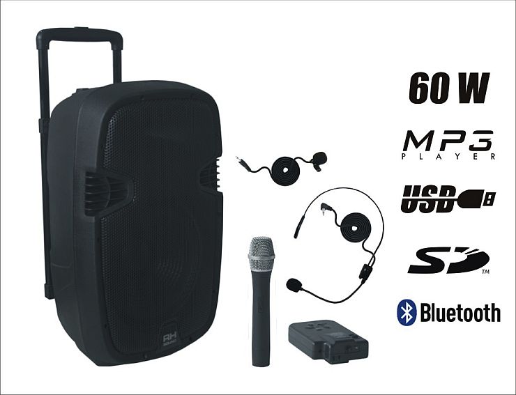 Aktywny dwudrożny, przenośny system nagłośnieniowy PA z wbudowanym akumulatorem oraz podwójnym mikrofonem bezprzewodowym doręcznym oraz nagłownym i krawatowym. Wbudowany odtwarzacz MP3, USB / SD. Zestaw nadaje się do zastosowań mobilnych. Głośnik niskotonowy o średnicy 12 " oraz 1,5" głośnik wysokotonowy z wbudowanym wzmacniaczem o mocy 30W RMS zapewnią wysoką wydajność w wielu zastosowaniach. Dwa wejścia mikrofonowe (TR/JACK 6,3 mm), jedno wejście liniowe (RCA) i jedno wyjście liniowe (RCA) pozwalają na podłączenie szerokiej gamy urządzeń zewnętrznych jak również podłączenie zestawu do dodatkowego systemu PA. Wbudowany podwójny mikrofon bezprzewodowy o zasięgu do 50 m pozwala na wygodną obsługę każdej kameralnej imprezy, spotkania czy przedstawienia. Interfejs Bluetooth z profilem A2DP pozwalający odtwarzać na zestawie źródła dźwięku z interfejsem BT np. z telefonu komórkowego, tabletu itp. Odtwarzacz MP3 z podświetlanym wyświetlaczem oferuje możliwość odtwarzania muzyki z klucza USB lub karty SD wyposażony w nadajnik zdalnego sterowania. Transport odbywać się może na wbudowanych kółkach transportowych przy pomocy teleskopowego uchwytu.